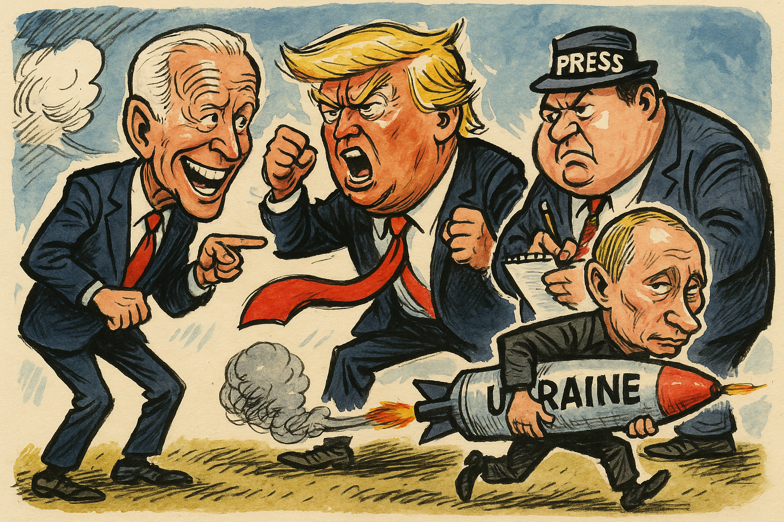 On the left, President Joe Biden is illustrated with a huge grin, exaggeratedly pointing and laughing. His pose is casual, almost gleeful, as though enjoying the chaos unraveling around him. The artist seems to mock his perceived aloofness or detachment—perhaps implying that Biden is more interested in the spectacle than in serious diplomacy.